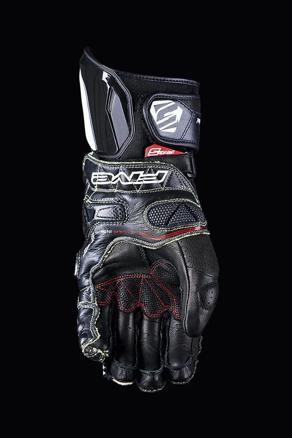 De meest geavanceerde FIVE ADVANCED GLOVES?. Ontworpen voor maximale prestaties, biedt de RFX Race het hoogste veiligheidsniveau dat momenteel op de markt verkrijgbaar is, dankzij de drievoudige beschermende schaal van duoplastic koolstofvezelversterkte kunststof. Dit materiaal, dat gewoonlijk in de luchtvaart of Formule 1-races wordt gebruikt, biedt een uitstekende schuurweerstand. Daardoor biedt de handschoen een doeltreffender bescherming dan een gewone handschoen zou kunnen bieden in een extreme situatie, zoals een lange slip waarbij de hand van de rijder klem komt te zitten tussen die van het wegdek en de motor. De bescherming wordt gemaximaliseerd door het gebruik van volnerfleer, meerdere versterkingen met traditioneel carbon en een Kevlar® binnenvoering. De handpalm is versterkt met Digital Pittards® leer voor optimale grip in natte omstandigheden. De klittenbandsluiting is verborgen onder een beschermende lederen flap om het risico te verkleinen dat de handschoen bij een val wordt afgerukt. Precisiesturing en comfort waren de belangrijkste overwegingen. RFX RACE: Dit is de handschoen die is ontwikkeld en ook is gebruikt door VIJF rijders in MotoGP, SBK en Endurance wereldkampioenschappen.