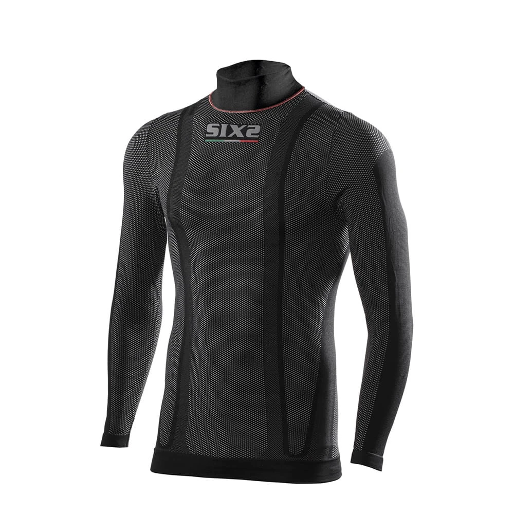Het SIXS Carbon Underwear shirt met lange mouwen en opstaande kraag is ademend en thermoregulerend in alle weersomstandigheden. De lange mouwen omsluiten de armen volledig, houden de huid fris en liggen tussen de huid en de overkleding. Tegelijkertijd beschermen ze gemakkelijk tegen koude tocht wanneer een versie met korte mouwen over het shirt wordt gedragen. De opstaande kraag beschermt ook de nek tegen plotselinge temperatuurschommelingen en tocht.